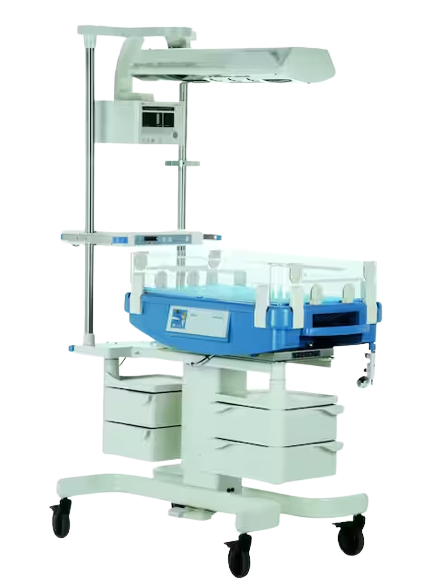 Our efforts to provide the best possible ergonomics are reflected in a number of practical features. The control panel is positioned directly beneath the radiant warmer, so you can easily adjust the settings. You can easily read all essential information on the large, bright digital display from any position around the bed. A bright red central warning light at the end of the radiant warmer will alert you to an alarm condition, even if you are working with another baby or in a different part of the room. A clear text message then provides all the details you require. The height of the unit can be adjusted to suit your height, swivel cabinets provide storage space for accessories, and all moving parts and control functions are easy to handle.